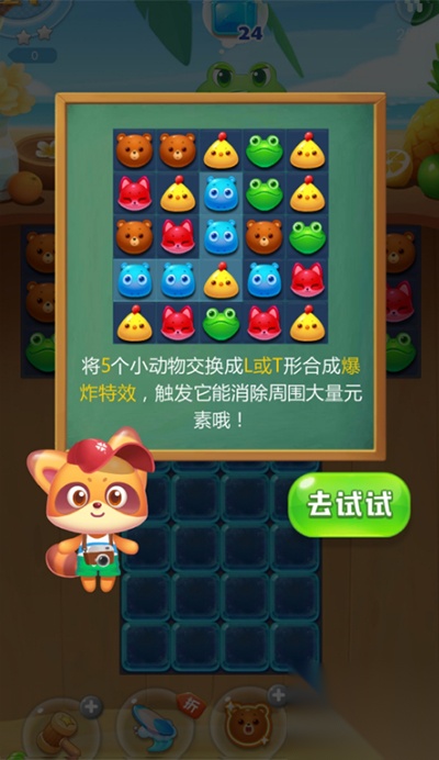 1. 当5个颜色相同的动物组成T形或者L形时,会合成爆炸特效。