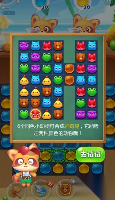 1、当5个颜色相同的动物排成一条直线时,就会合成魔力鸟。