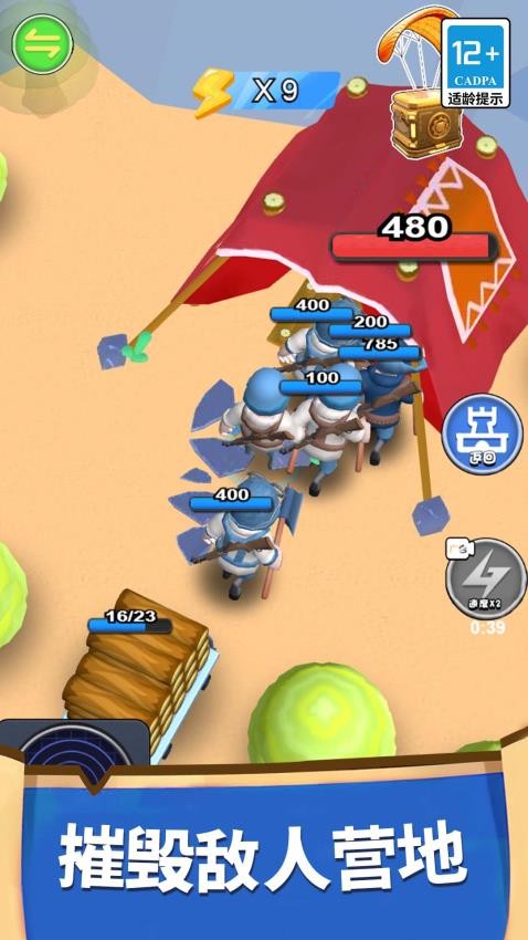 倘若你对这款游戏感兴趣,那就赶紧来试玩体验一番吧!率领士兵,采伐并收集木材资源,击败敌方士兵,扩充军团队伍规模。攻占敌方大本营,对士兵与板车进行合成升级,提高战斗力,进而成为此地的霸主。赶紧率领你的军队去纵横沙场吧!