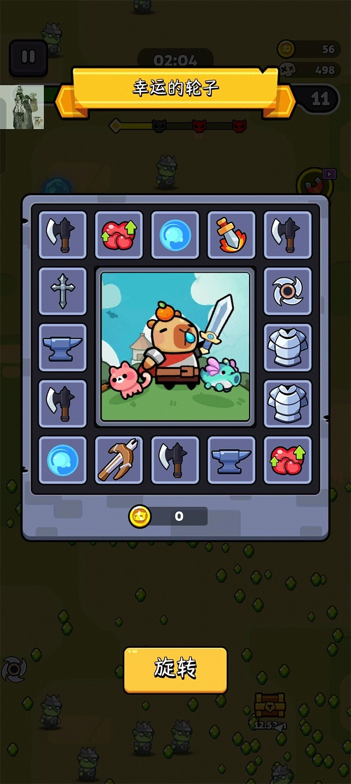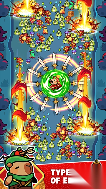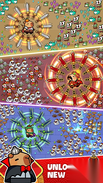 3、画面风格色彩鲜艳,搭配Q版萌趣的水豚形象,营造出轻松愉快的割草氛围。