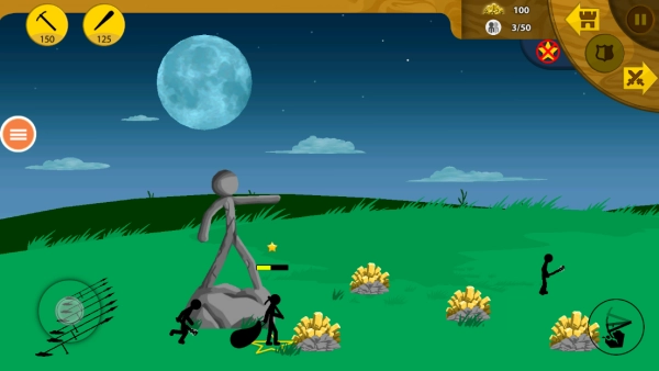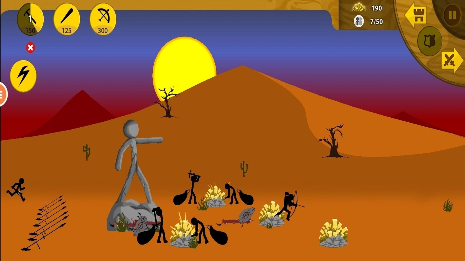 5. 如图所示,玩家要操控火柴人进行挖矿,利用挖到的金矿兑换不同兵种的火柴人,再依据敌人实际状况排兵布阵,从而赢得胜利!