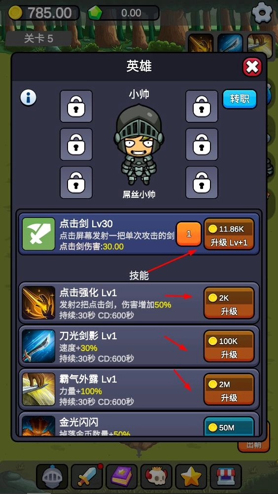 2、来到英雄界面,花费金币对点击剑、点击强化等技能进行升级,以此提升攻击伤害、攻击数量等属性。