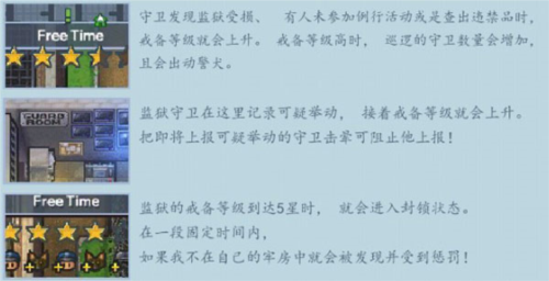 在本次教学关卡里,对于监狱规则,仅通过点名给出简要提示。而在其他监狱场景的游玩过程中,玩家一天内要经历多次“点名”。在规定时间内,玩家必须到达指定地点,不然警戒等级和被关注程度会持续上升。