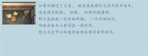 2晚上23:00晚点名结束,点到名之后,立刻前往小房间,去挖开小房间与发电机房之间的墙壁。挖开这面墙壁恰好需要100体力,要是体力不够,你可以选择喝一瓶饮料来补充。