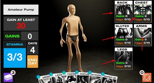 4、右侧呈现了不同部位的肌肉数量,每张卡牌所能增加的肌肉量存在差异,合理运用这些卡牌极为关键。