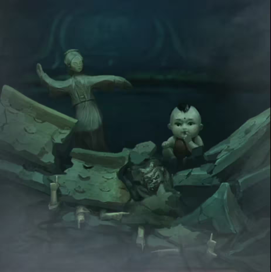 完成小游戏后,去查看位于中间位置的雕塑,将雕塑调整成前面挂牌上所展示的乐器样式。其中,第一排的乐器组合是【鼓 - 钹 - 锣】,第二排是【锣 - 禄 - 唢呐】,这里要留意一下,中间有个“禄”需要进行调整。调整结束后就和上图一样,此时房屋会倒塌,下面会露出手臂。先把后面的【泥娃娃】和【跳舞人偶】拿走,接着记住压在下面的手臂方向,为【上下右下左上】。