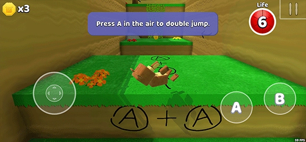 4、偶尔也会碰到长度较长的陷阱坑,先点击A,接着点击B,同时配合摇杆向前操作,就能实现飞跃。