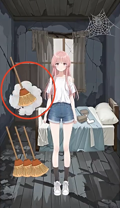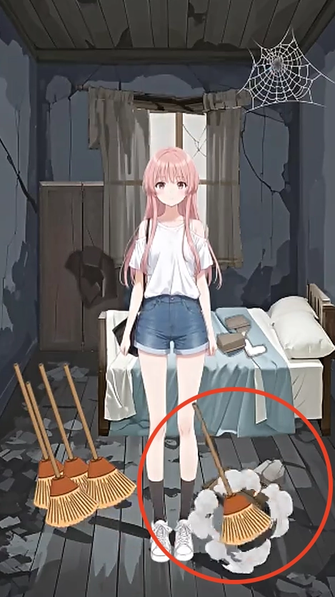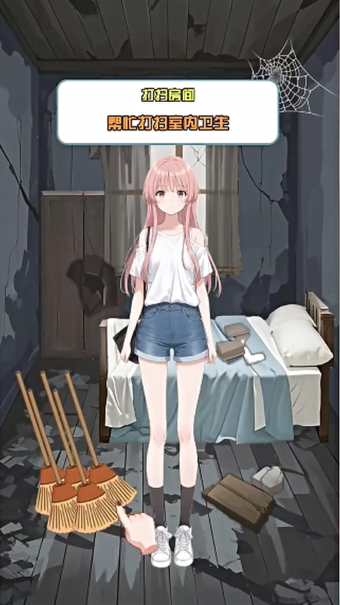 2、把左下角的扫把拖到需要清扫的角落,就能开展清扫工作。其中也包括女主左脚旁的杂物。