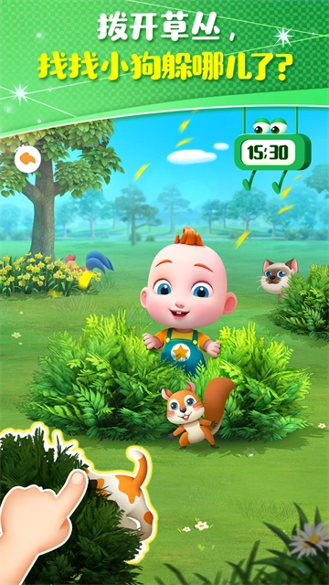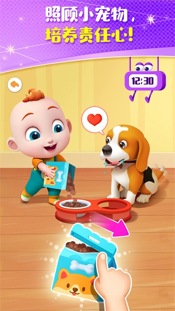 听,汪汪叫的是谁呀?原来是小狗Bingo呢!它的肚子都快饿得前胸贴后背啦,急需给它喂点吃的。宝宝快来搭把手:把狗粮袋子撕开,将宠物餐盆装满。咦,Bingo似乎还没吃够?那就拿出开罐器,再给它开一个宠物罐头吧。 Bingo出去畅快“兜风”咯!哎呀,这小家伙玩得浑身脏兮兮的,得赶快给它清洗一番:用夹子,把Bingo身上的杂草清理掉;拿起刷子,把爪子上的泥块刷干净;往浴花上挤些沐浴露,还能顺便给Bingo来一场泡泡Spa呢。