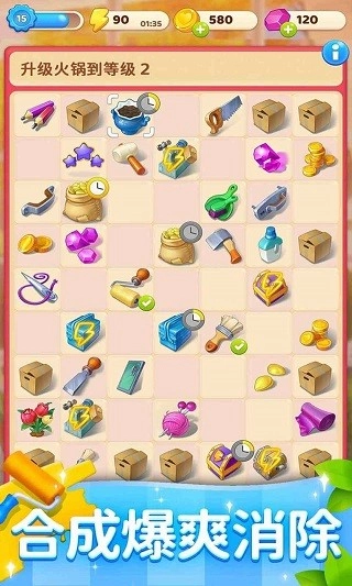 4、消除玩法和规则有了变化,采用合成与拆解相结合的形式,带来较为新奇的体验。这一改变让游戏对玩家脑力有较高考验。同时,房屋的装修与翻新需要借助工具,通过简单合成并不断闯关来实现。