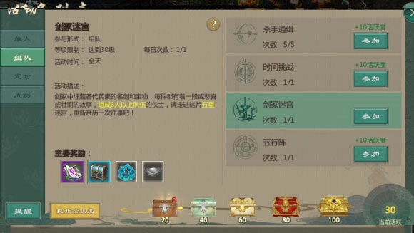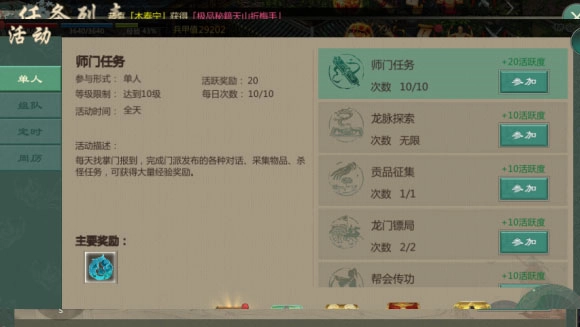 ②组队任务:指活动中的组队任务。玩家通过组队形式,优先推荐固定队,以一条龙的方式完成任务,可获取大量经验,以及银两、玄晶、秘籍等道具。