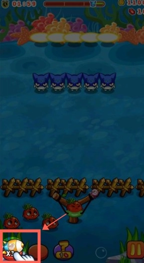 操作时,借助弹弓拉动屏幕中的蔬菜,对准敌方怪物后,松开手指就能发射。