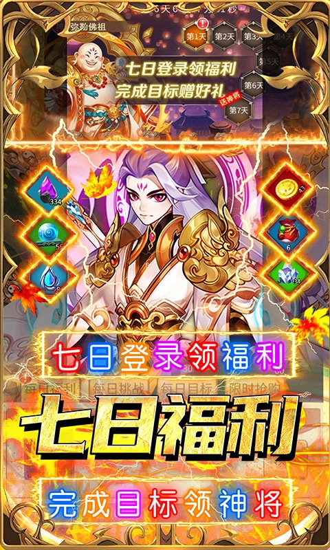 3、七日福利大放送!完成指定任务,即送超强神将——弥勒佛祖,助你纵横天下,所向披靡。