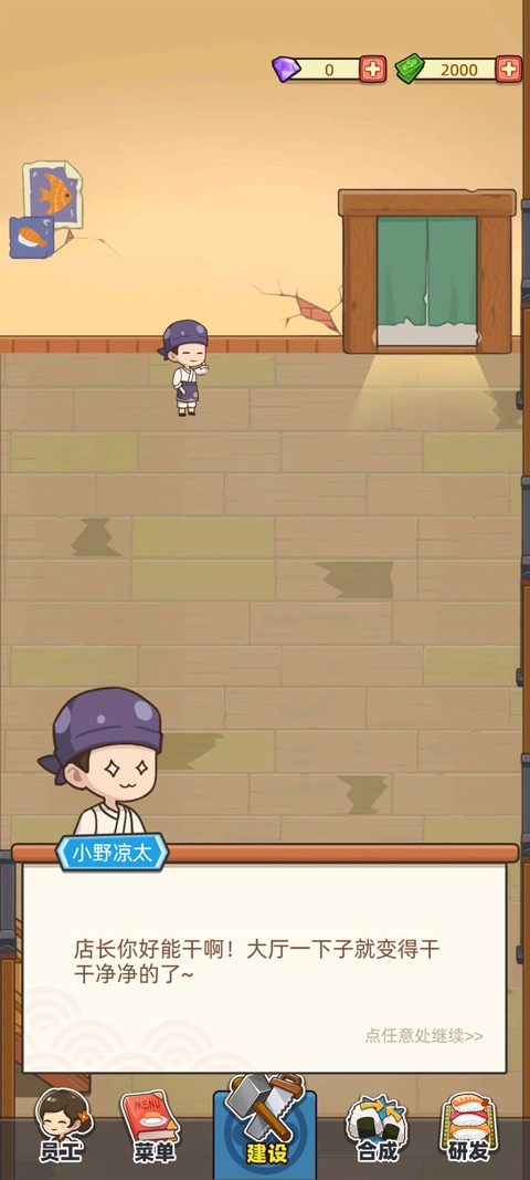 1. 玩家接手的是一家看上去略显破旧的寿司店,起初需开展清理与装修工作,使店面呈现出全新的面貌,方可开启经营。