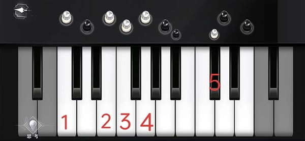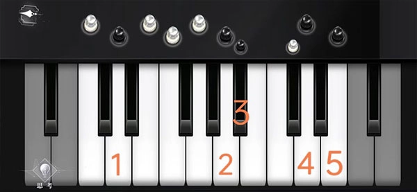在钢琴处进行观察并弹奏,当进入钢琴界面后,首先点击思考,从而得出位置与颜色信息,随后仅弹奏与白色棋子相对应的琴键,具体情况如下图所示: