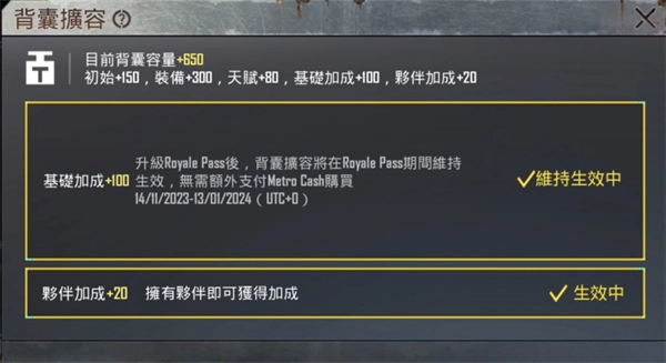 ● 当你升级Royale Pass后,背囊扩容功能会在对应的Royale Pass期间,并且是地铁逃生赛季开放的时间段内生效,无需额外支付Metro Cash。