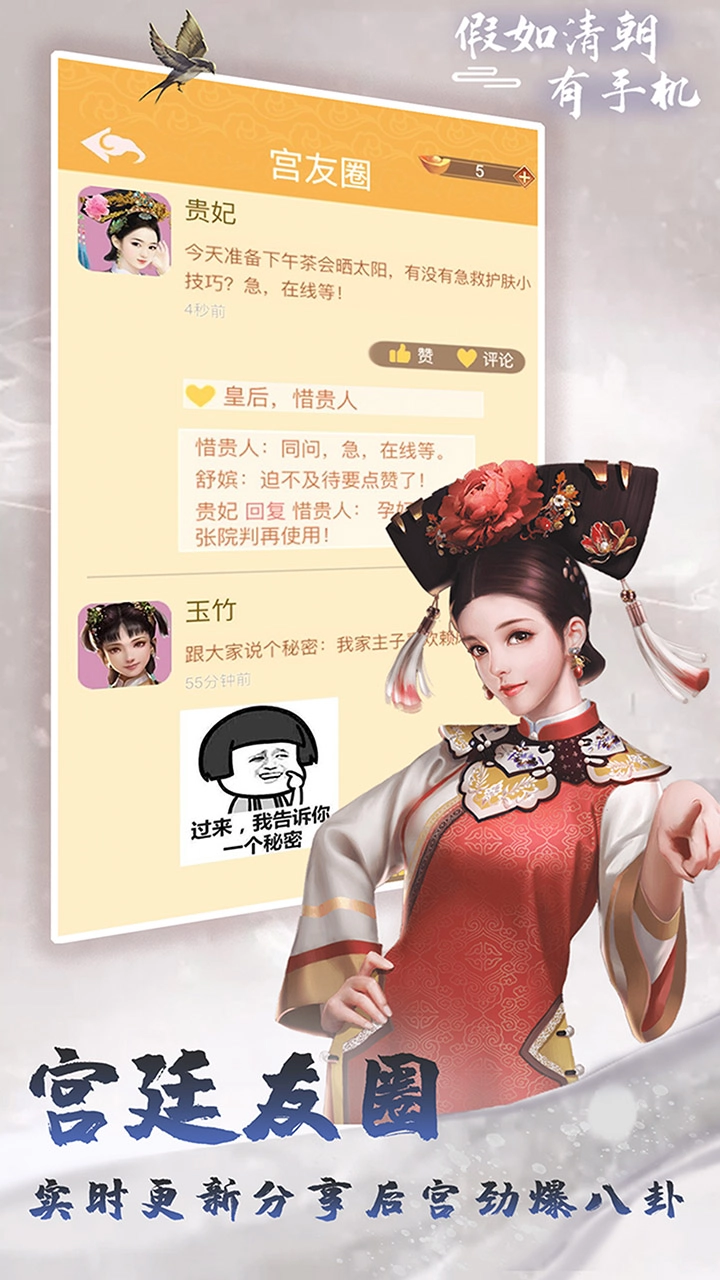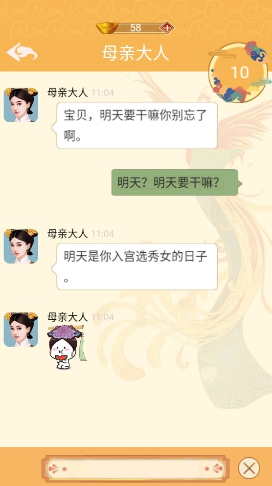 游戏玩法丰富多样,其中模拟微信聊天功能最为关键。借助手机,你能够与众多妃子、家人以及皇上展开对话交流,以此增进彼此感情。