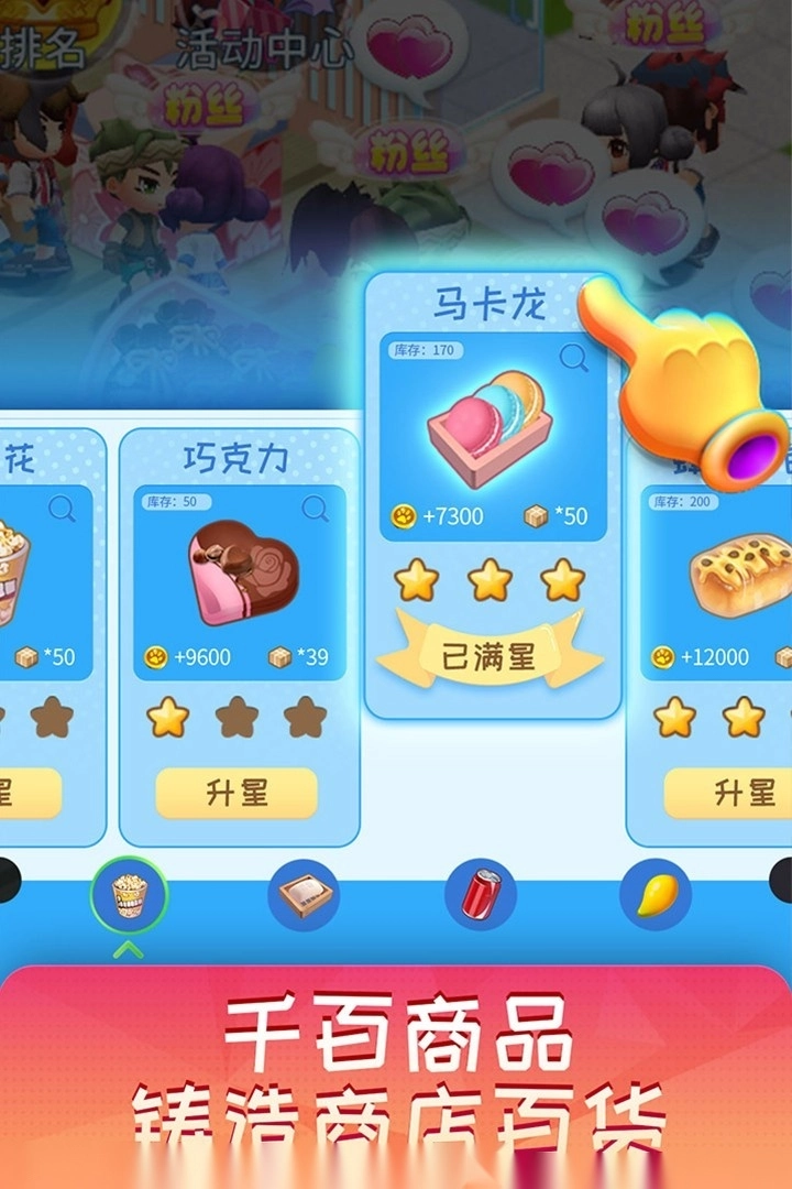 1当超市好评值达到特定水平时,会邀请高人气明星为你的超市进行宣传,并代言超市内的商品。