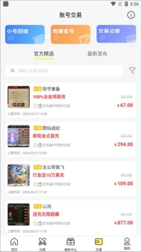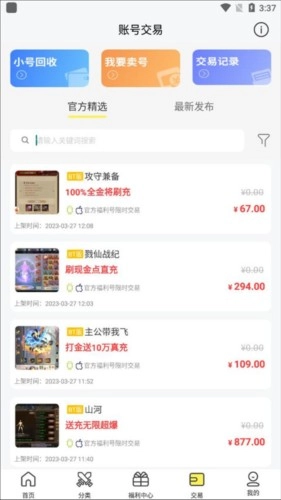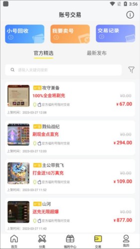 5、点击交易专区,这里还支持卖号、回收、记录交易等操作。
