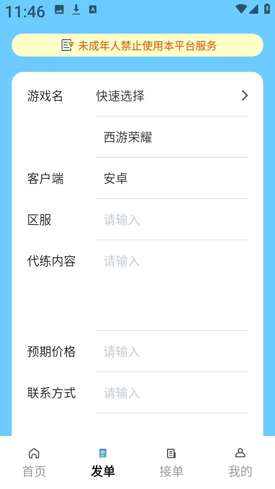4、接下来可自行设定输入区服、代练内容、预期价格等信息,完成后即可直接点击“立即发单”。