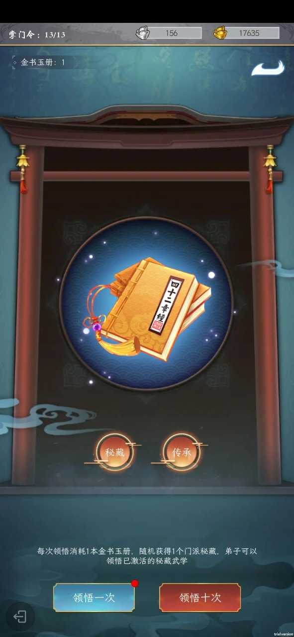 在这款游戏里,设有100余种来自不同门派的武学。玩家能够借助金书玉册,于藏经阁中领悟随机出现的武学。当成功收集武学后,即可激活门派秘藏,进一步充实门派的底蕴。如此一来,门下弟子便能够领悟那些已经激活的秘藏武学。