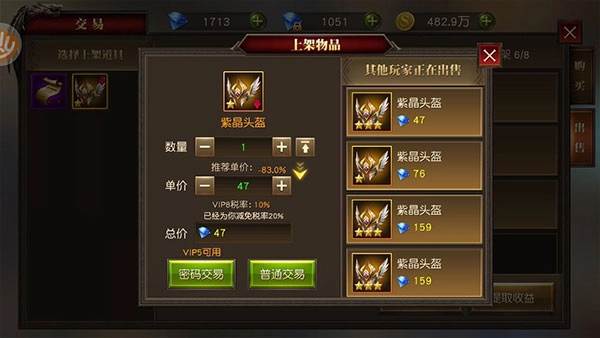 4、出售界面与购买界面截然不同。于出售界面,您能够在左侧挑选打算出售的道具,并自定义价格及出售数量。确实,要是您达到特定的 VIP 等级,便还可享有密码交易的特权。在界面右侧,您还能瞧见其他玩家针对同类型道具所定的价格。在此建议您,当同类型道具出售量较多时,可适当降低自身定价,如此一来,您的道具便更容易被其他玩家买走。