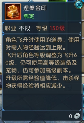 当诛仙全部服务器内完成飞升任务的总人数累计达到100000时,会在当周维护过后正式开启飞升功能。玩家角色达到150级且经验已满的情况下,于河阳城打开包裹,使用涅槃金印,就能实现飞升。飞升之后,角色等级提升至飞升60级。玩家依旧可以使用高级装备以及宠物,也依旧能够参与高级副本。不过,角色升级所需的经验值会有所降低,击杀怪物所获取的经验也会相应减少。