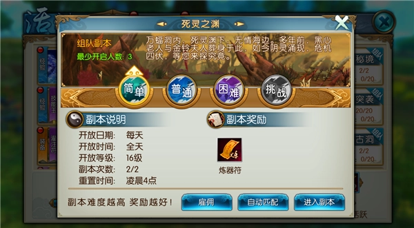 《诛仙》中“死灵之渊”副本,角色达到16级即可进入,每日能获取2次奖励,重置时间设定在凌晨4点。