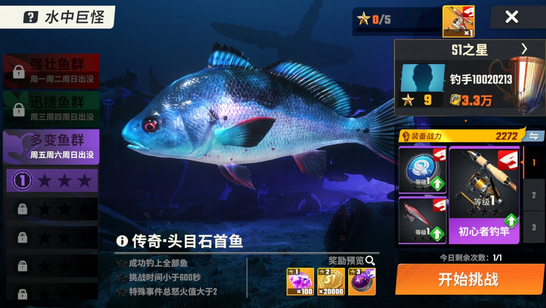 每个鱼群都设置了多个难度级别。在每一级难度的挑战中,每次挑战成功能够学习到一个技能,而且还有可能触发特殊事件。只要成功战胜当前难度的水中巨怪,就能解锁下一级难度。