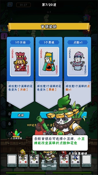 6、成功战胜关卡首领后,玩家将会获取小丑牌。此牌具备独特能力,能够随机改变英雄的点数与花色,进而为整个战局增添诸多不确定性与变数。