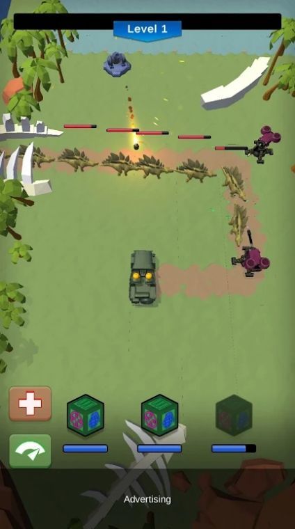 1. 操作极为简便,只需动动指尖,轻松滑动小箱子(炮塔),就能投掷攻击恐龙。 2. 建议把炮塔放置在道路两侧,切勿置于路中央,否则恐龙会将炮塔摧毁。