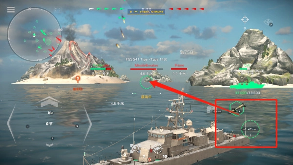 5、当发现地方战舰时,我们能够通过滑动屏幕来调整武器的瞄准方向,点击如下图所示的位置,就能迅速使用武器进行开火射击。