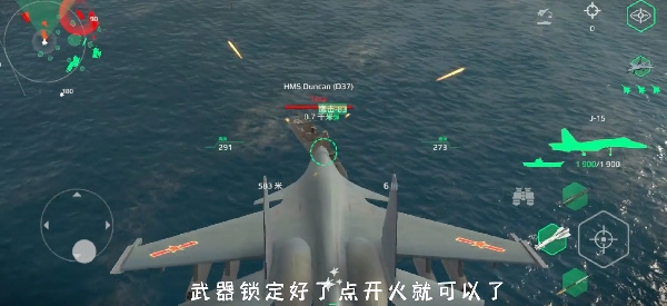 3、向上滑动屏幕为拉升操作,向下滑动屏幕则是俯冲操作,点击武器锁定后进行开火。