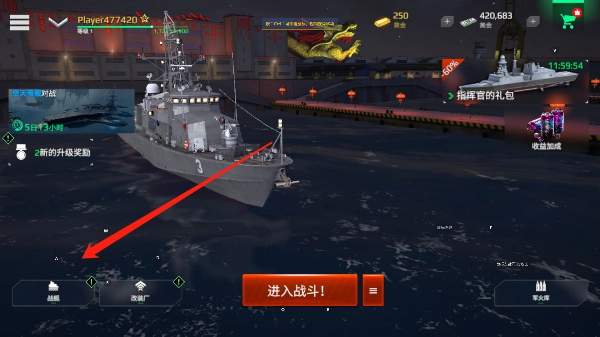 1. 进入游戏主页,点击左下方的“战舰”,即可打开商店,具体位置参照下图。