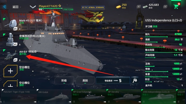 3、购买部分战舰,不仅要耗费货币,还存在等级要求。不过,购买此类战舰能够解锁更多武器与玩法。以图中战舰为例,玩家购买后,即可尝试驾驶AH64阿帕奇战斗机投入战斗。