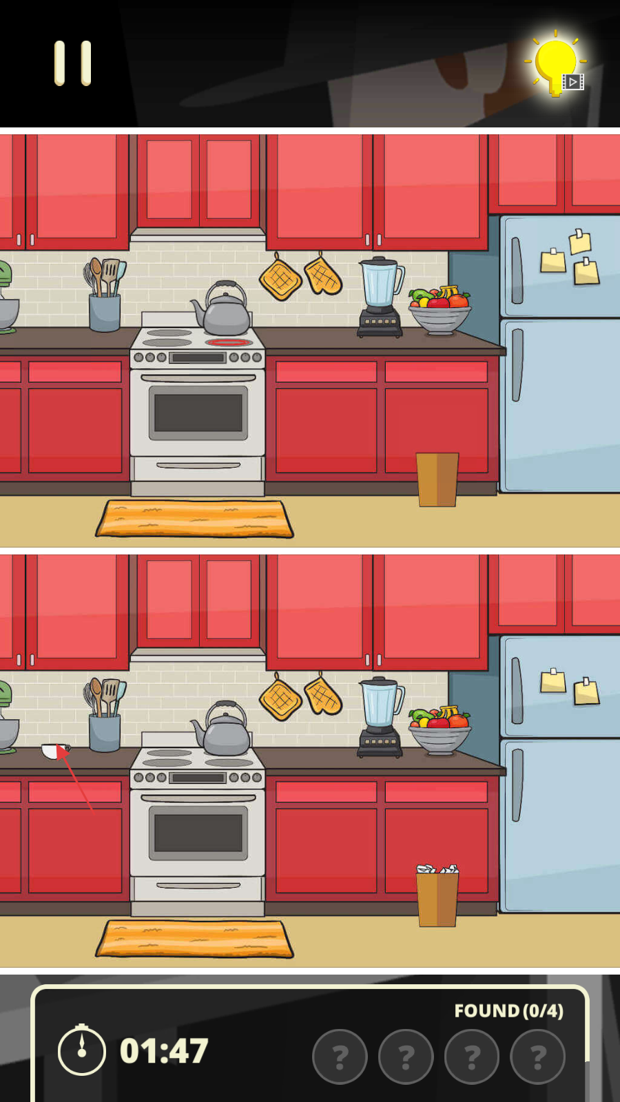 3、要是游戏卡关了,点击灯泡图标,就能获取提示,从而快速找齐不同之处。