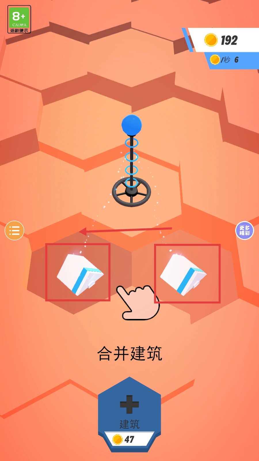 2、有两个相同建筑时,按提示拖动合并,合成更高级建筑,提升金币产出效率。