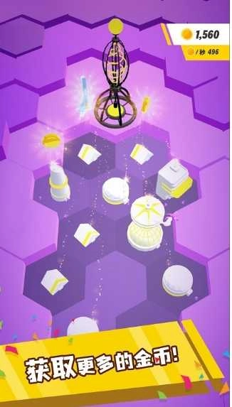 4、注意画面中发光的道具,拾取后可获得额外收益。同时,要关注右上角显示的金币每秒产出数量,合理规划建筑的建造、合并与升级,以此扩大星城的规模。
