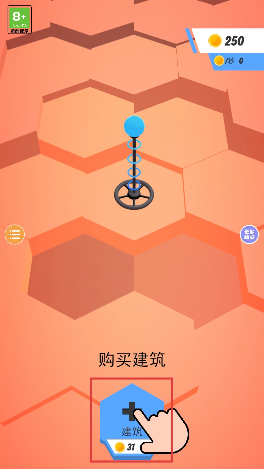 1. 开启游戏后,找到【购买建筑】按钮,消耗金币点击该按钮,于六边形的空地上建造初始建筑,以此积累资源。