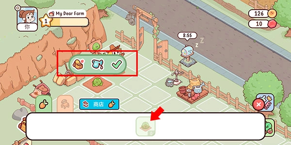 2、把物品拖动到方格上,然后点击后方的勾号,这样就能完成种植。上方的功能,从左到右依次为收纳至背包、浇水以及确定种植。