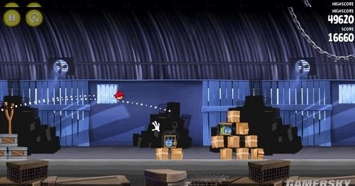 在这一关中,同样需要让红色小鸟去摧毁左边的笼子;接着,在红色小鸟下落过程中,使其击中右边障碍物的下部,进而让右边的建筑物失去平衡。