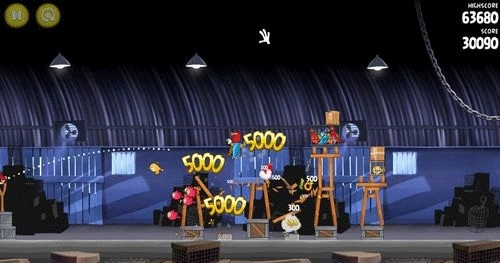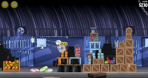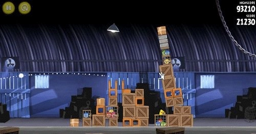 这一关和前面类似。先让小鸟散射,摧毁前方的两个建筑物;接着把剩余的物件推倒最右边的建筑物。