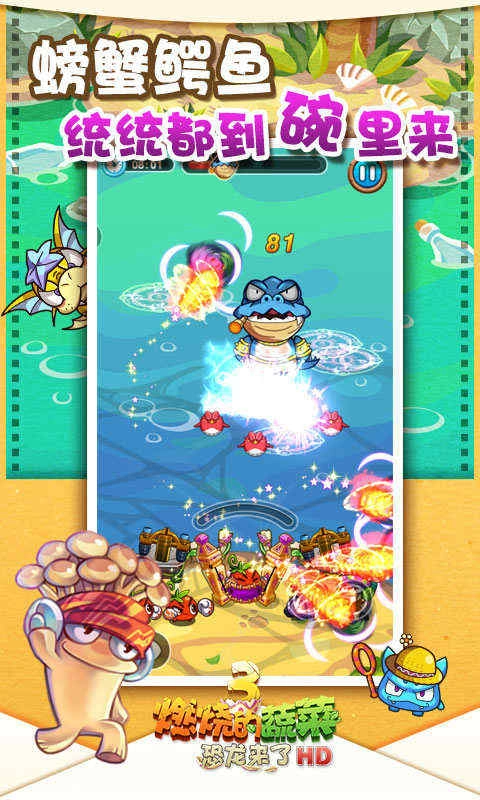 2、画面色彩更为绚丽饱满,其中,无论是主角的小蔬菜,还是敌人的小怪物,其Q版设计都被打造得极为可爱。