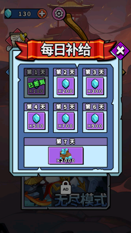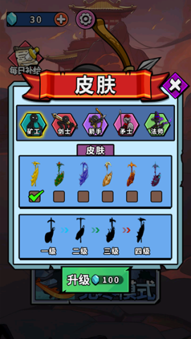2、玩家能够自主选择经典模式或者无尽模式,每位英雄皆有独具特色的皮肤可供挑选,还能用钻石对皮肤进行升级,矿工、剑士、箭手等五位英雄随你选择。