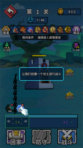 4、在选择经典模式后,点击第一关,接着选择全军出击,就能开启游戏。一开始先创建一名矿工来采集资源,随后招募剑士投入战斗。