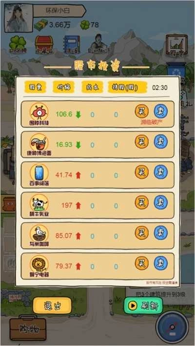 5、游戏发展到后期,会解锁更多新颖玩法,像股票这类。当我们积累了一定资金后,就能投身股票市场进行投资,借此获取更多利润(不过,也存在血本无归的风险)。