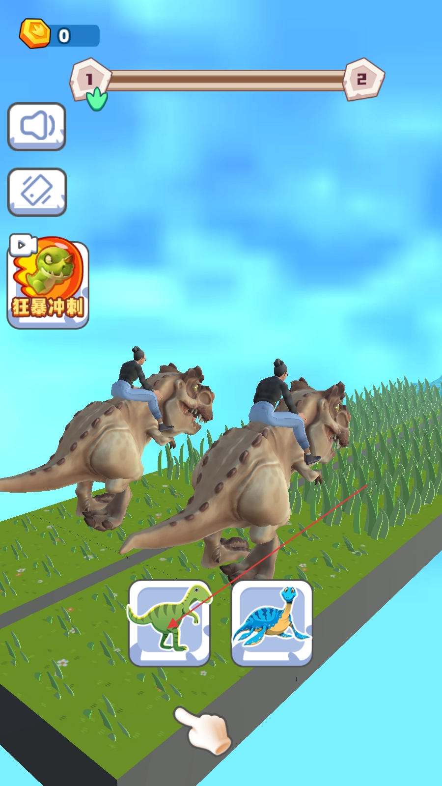2、游戏中按提示切换恐龙,如点击不同恐龙图标来更换,利用上方的【狂暴冲刺】等技能,躲避障碍,顺利通过关卡。