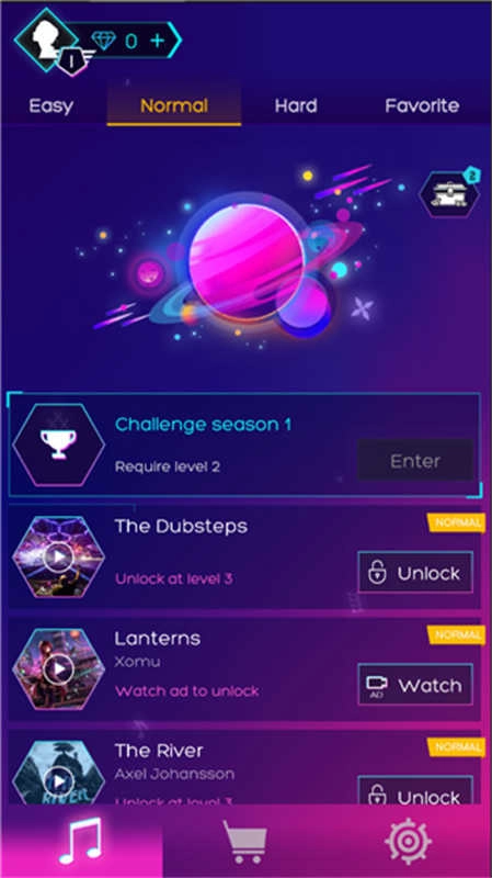 8、而且每首音乐的挑战,玩家都拥有3次机会,当3次机会用完,挑战便宣告结束。当然,你也可以使用钻石来增加额外的挑战机会。