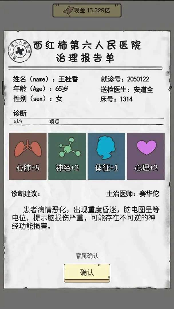 3、花费金钱为身患重病的奶奶进行医治,待奶奶的生命值回升到100%时,就能顺利通关。