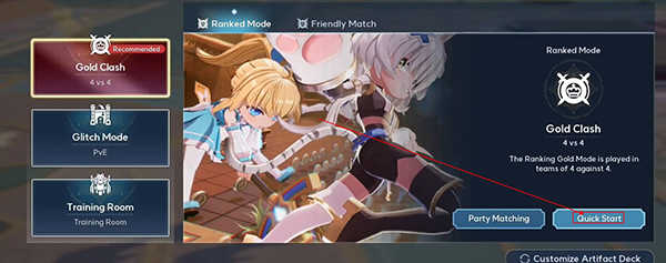 玩家若想进入4v4竞技模式,可选择“Gold Clash”,随后点击右下角的“Quick Start”就能开启游戏。